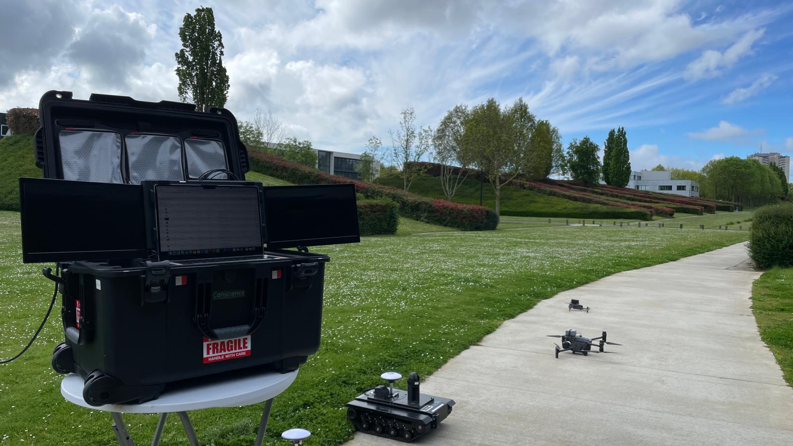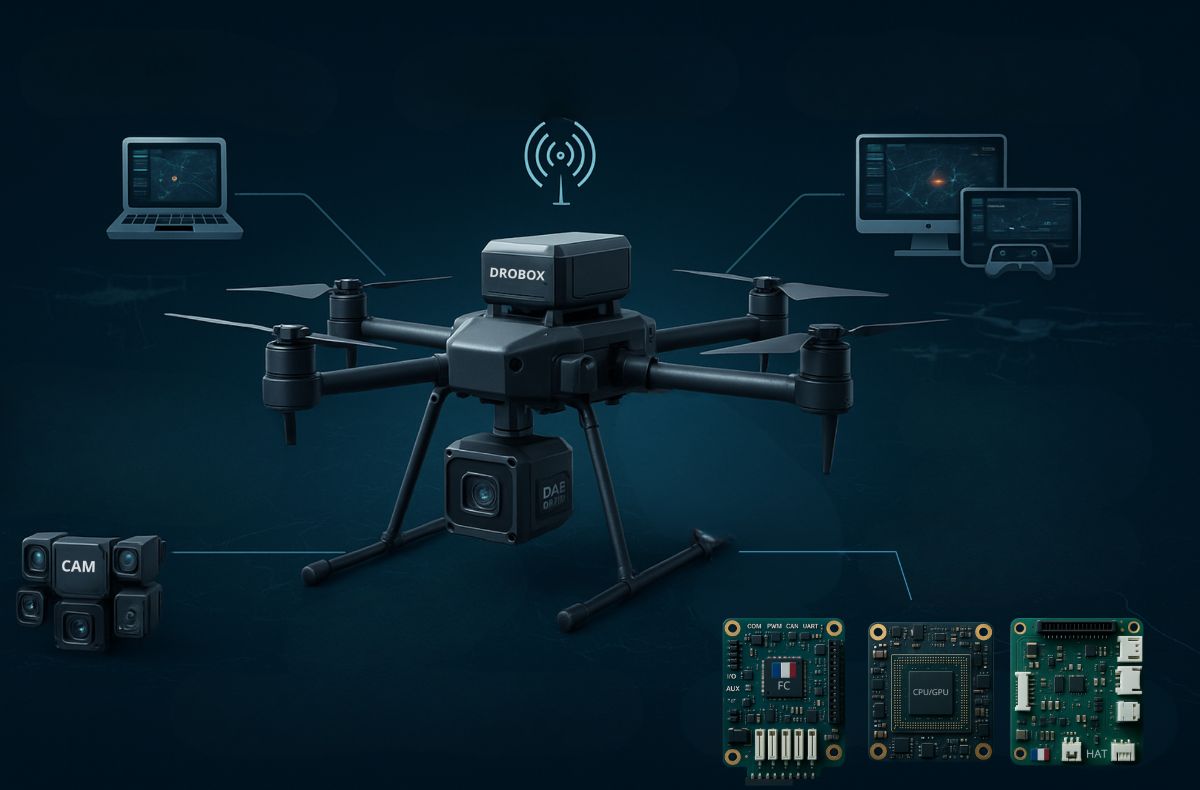 La DroBox est le cœur intelligent : une unité de calcul embarquée conçue et assemblée en France, assurant les traitements IA, navigation automatisée et communication multi-protocoles.