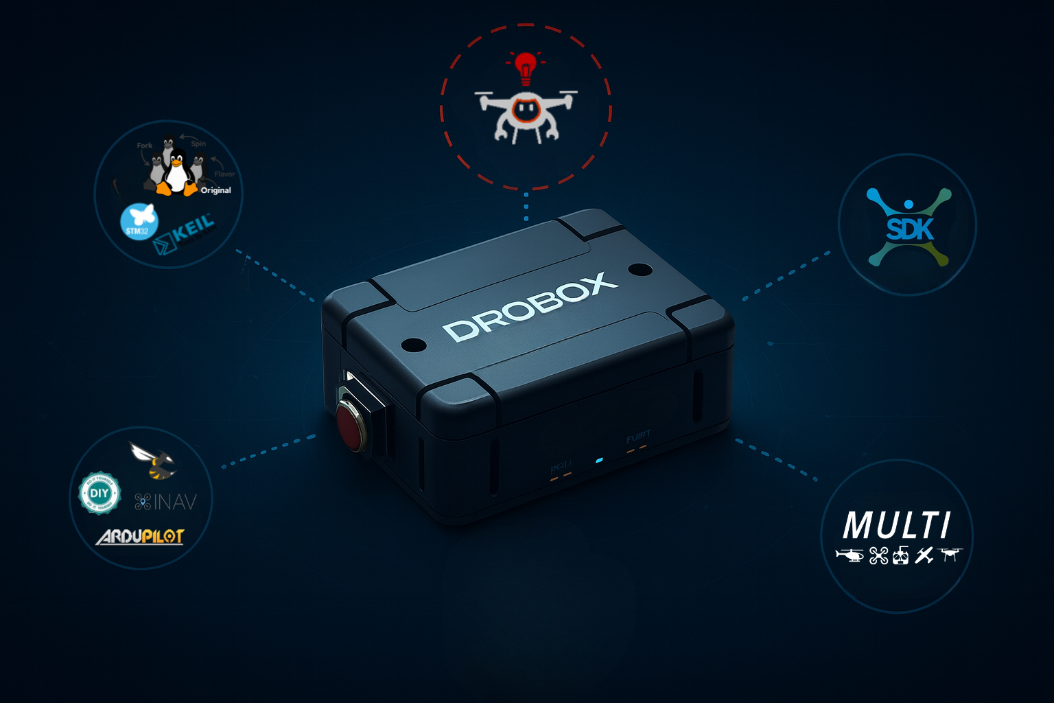 - Réseau : Interfaces multi-protocoles – Ethernet, CAN, UART, USB, Wi-Fi, LTE/4G-5G, radio propriétaire, MAVLink/ROS en option