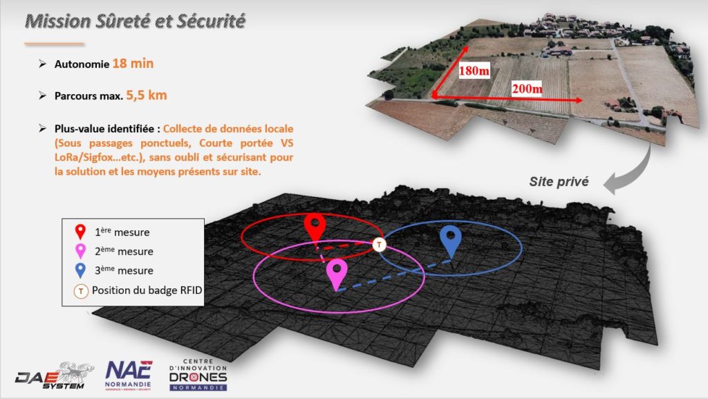 DAE SYSTEM a utilisé un drone DJI matrice series 210 V2, auquel ont été ajoutées des briques technologiques conçues et adaptées spécialement lors de la phase de test. Un lecteur RFID ainsi qu’une caméra étaient embarqués sur le drone. Les données récoltées par détection issues des badges actifs sont interfacées avec un système de traitement et d’analyse de données grâce à une couche logicielle (middleware) qui s’intègre dans l’existant : directement dans la station sol du système du drone aérien.