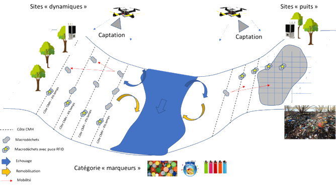 - Suivi régulier des conditions de dépôt/remobilisation des macro déchets : Traçabilité de déchets badgés par drone;