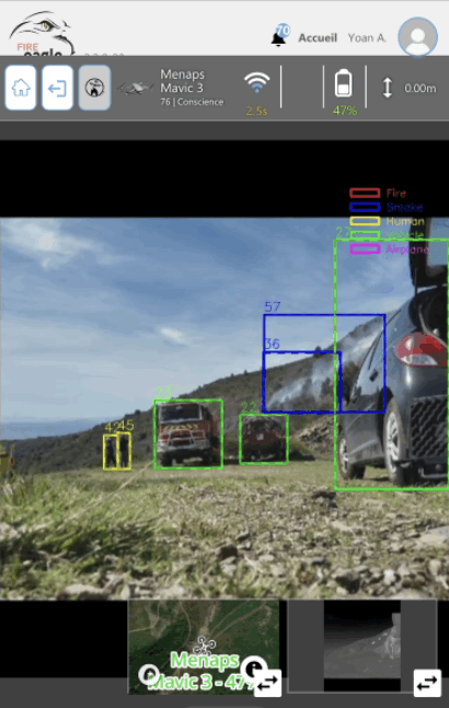 FIRE EAGLE est un système d’intelligence aérienne entièrement opérationnel, prêt à l’emploi, conçu pour la détection en temps réel d’incendies et de fumées à l’aide d’une intelligence artificielle basée sur le cloud avec un axe de sécurisation dédié. Le système intègre :